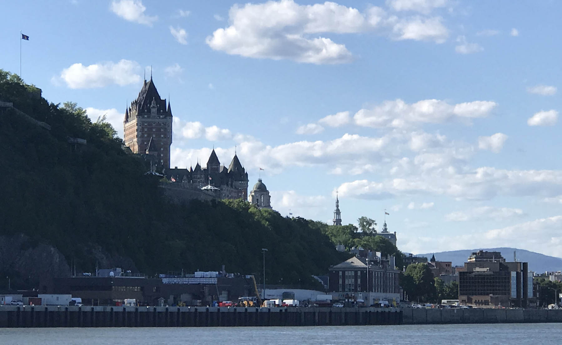 All goes well and by 17:30 we are approaching Quebec’s twin bridges, with their very fast currents of 5 or 6 knots – just as a tanker is coming up behind us and a tanker is heading towards us. We wait to let the first pass us, then we tuck in behind him. As we go under the second bridge, the other tanker passes the other way and makes an enormous wake – truly, it was like handling the boat in a very rough sea – and it went on and on, our boat pitching up and down like a bronco. Welcome to Quebec.